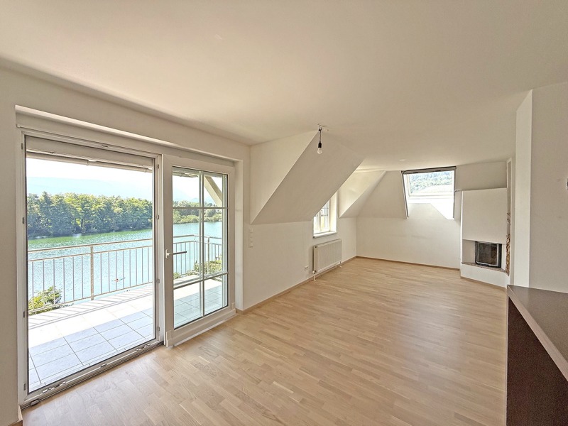 Die Wohnung verfügt über drei Schlafzimmer, zwei Badezimmer und einen großzügigen Wohn-Essbereich, der sich auf die Südwest-Terrasse mit einzigartigem und unverbaubarem Seeblick öffnet. Die Logenplatz-Terrasse bietet den ganzen Tag Sonne und einen atemberaubenden Blick auf den See und die Karawanken.